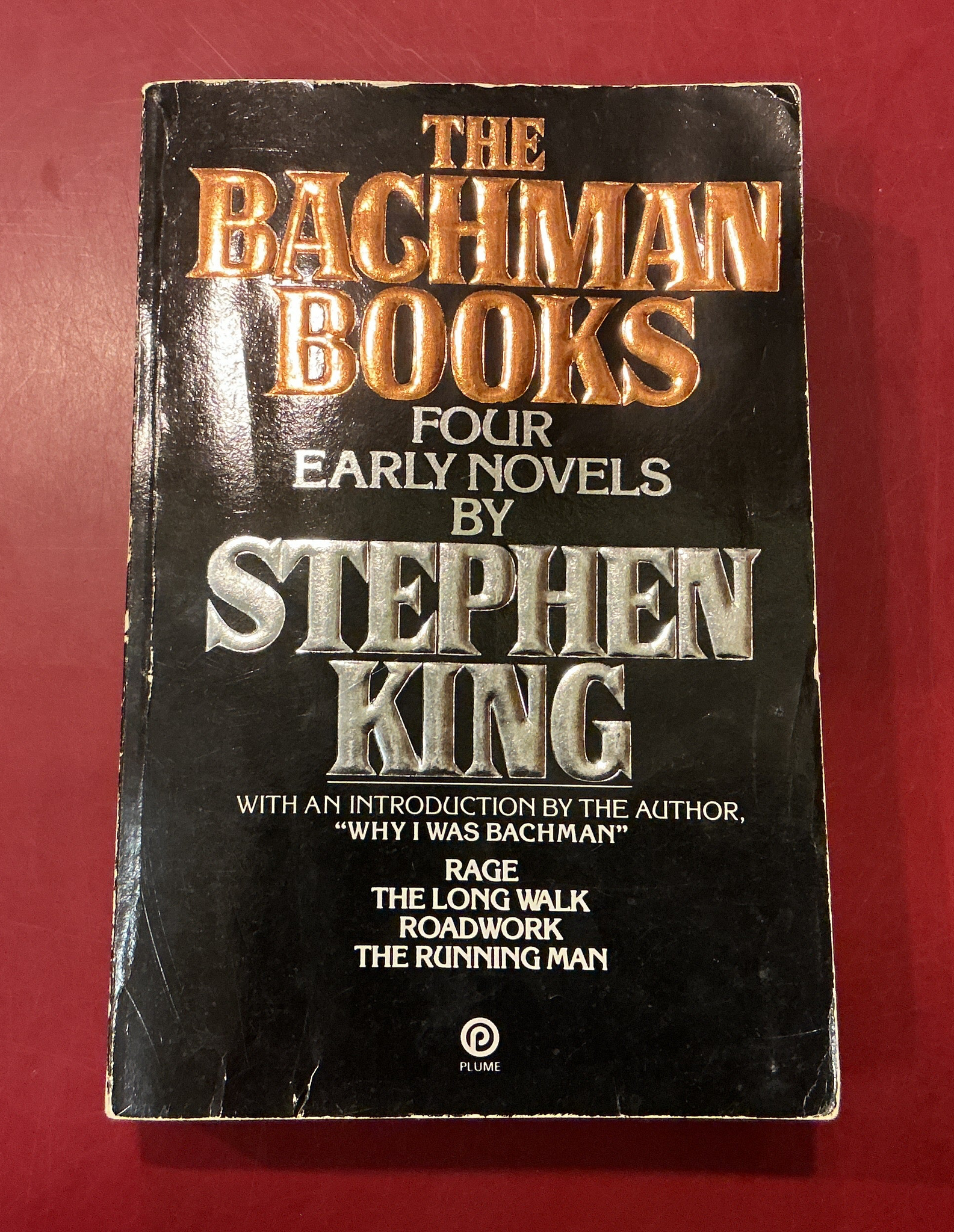 This is the first Plume (Omnibus) Printing, October, 1985. Includes the books Rage, The Long Walk, Roadwork, and The Running Man. Some yellowing on pages and scuffs along spine and edges.